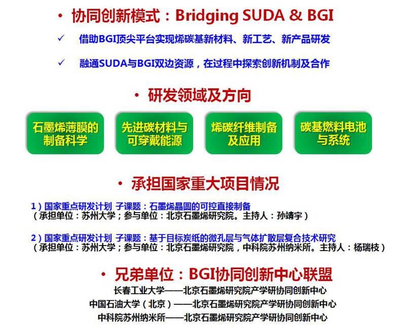 、能源与材料创新研究院、北京石墨烯研究院(BGI)联合组建的新型协同创新基地。中心面向江苏、北京乃至全国石墨烯科技及产业快速发展的人才需求和重大技术需求,聚焦石墨烯薄膜的制备科学、先进碳材料与可穿戴能源、烯碳纤维制备及应用、碳基燃料电池与系统等四大创新方向,开展以需求牵引为导向的石墨烯科学与工程技术研发和人才培养,着力解决石墨烯领域发展面临的关键科学技术问题。