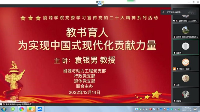 为深入贯彻学习党的二十大精神,12月14日下午, 财神捕鱼 原副校长袁银男教授为行政党支部、能源与动力工程党支部、退休党支部全体党员做“教书育人——为实现中国式现代化贡献力量”的主题讲座。会议由 财神捕鱼 党委书记沙丹丹主持。