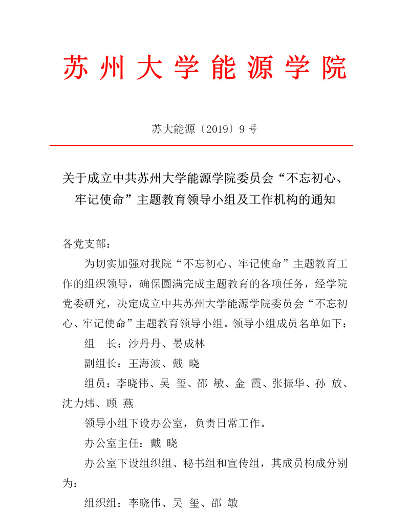 关于成立中共 财神捕鱼 委员会“不忘初心、牢记使命”主题教育领导小组及工作机构的通知 苏大能源〔2019〕9号