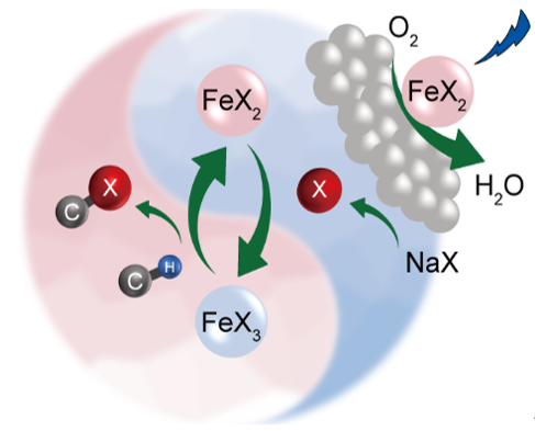 本论文报道了一种全新的异相光催化-FeX2/FeX3循环体系,能够以NaCl和NaBr为卤源,在常温常压下实现一系列有机物的C-H键高效、连续卤化。光照条件下, Fe2+能够加速分子氧还原动力学及活性氧物种的消耗速率,并被氧化产生Fe3+。这能够加速卤离子被空穴氧化的动力学过程,快速产生大量卤自由基加速C-H卤代。同时,氧化产生的Fe3+也可以在光照下将卤离子氧化为卤自由基并被还原为Fe2+,实现FeX2/FeX3循环并进一步加速卤代。