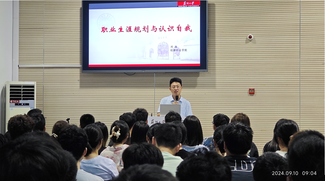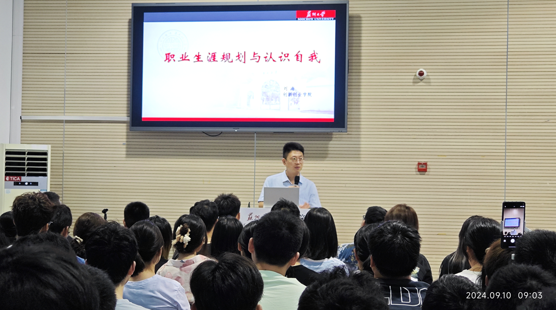 9月10日上午, 财神捕鱼 邀请校创新创业 财神捕鱼 实践与平台管理办公室主任刘海老师在多功能厅为新生带来了一场题为《职业生涯规划与认识自我》的主题讲座,活动由张振华老师主持。