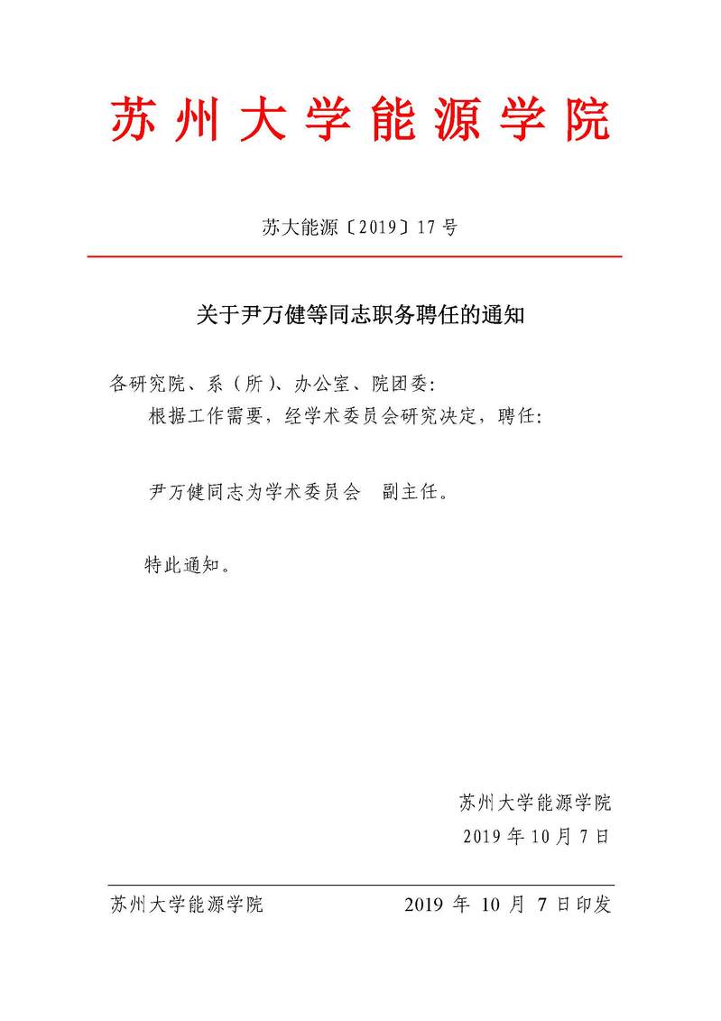 关于尹万健等同志职务聘任的通知 苏大能源〔2019〕17号