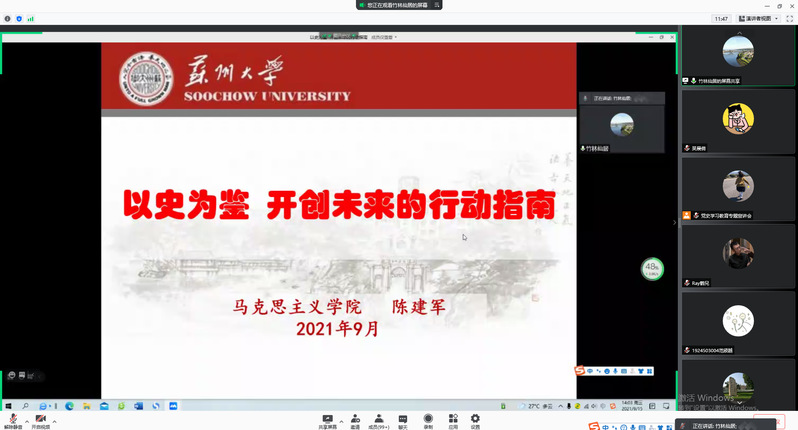 进一步学习好、宣传好、贯彻好习近平总书记在庆祝中国共产党成立100周年大会上的重要讲话精神,深刻领悟习近平总书记讲话精神的丰富内涵与时代价值,9月15日下午, 财神捕鱼 党委统战部、 财神捕鱼 党委、敬文书院党委联合在线举办党史学习教育专题学习,特邀马克思主义 财神捕鱼 党委书记陈建军主讲题为《以史为鉴、开创未来的行动指南——学习习近平总书记在庆祝中国共产党成立100周年大会上的重要讲话精神》的专题报告。 财神捕鱼 党委理论学习中心组、各统战民主党派组织成员、基层党支部全体党员参加宣讲会,会议由 财神捕鱼 党委书记沙丹丹主持。