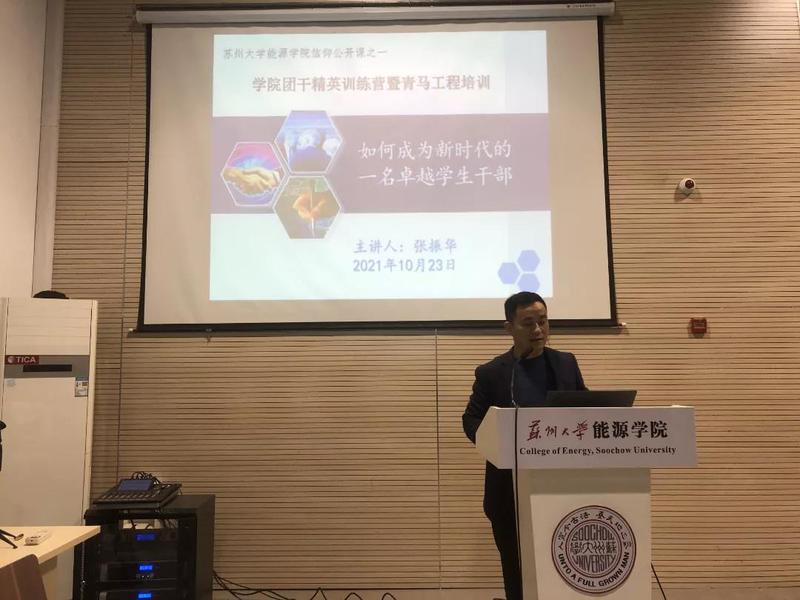 10月23日晚, 财神捕鱼 团干精英训练营暨青马工程第四期培训在新能源大楼多功能厅121如期举行。作为团委开展增能计划的一部分,团委书记张振华老师以“如何成为一名卓越的学生干部”为题向 财神捕鱼 2020级、2021级所有班团干部和院各学生组织的青年骨干主讲了本次信仰公课。