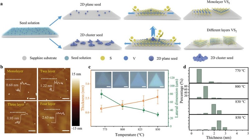 然而,在二维材料的少层薄膜形成过程中,由于薄膜材料表面的成核势垒较高,层控制生长很困难。本文提出了一种晶种溶液法(图1),通过精确控制金属前驱体的浓度,促进簇晶核的形成,改变基底表面晶种的成核模式,以确保后续反应有充足的金属源。研究表明,通过温度控制的动力学和热力学协同作用很容易生长具有可调层数的VS2薄膜。