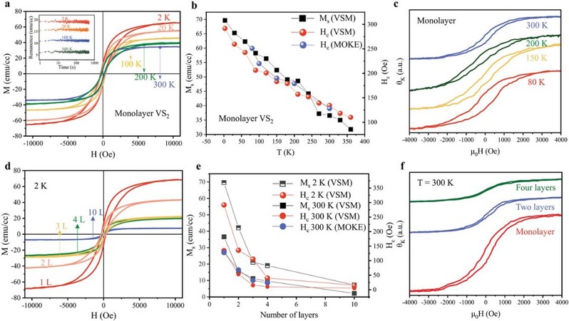 兼具半导体和铁磁特性的H相VS2薄膜可能成为下一代自旋电子器件的候选材料。物理性能测量系统(PPMS)和磁光克尔显微镜(MOKE)被用来评估不同层数的VS2单晶的磁性能(图2)。单层H相VS2纳米片在室温以上表现出很强的铁磁性排序,并且我们发现,随着厚度的不断增加,VS2薄膜材料的铁磁性能变弱,这可能是因为存在二维层状薄膜材料层间存在反铁磁耦合。本研究拓宽了二维层状磁性材料可调合成的途径,为新型自旋电子和磁电子器件的构建提供了可能。