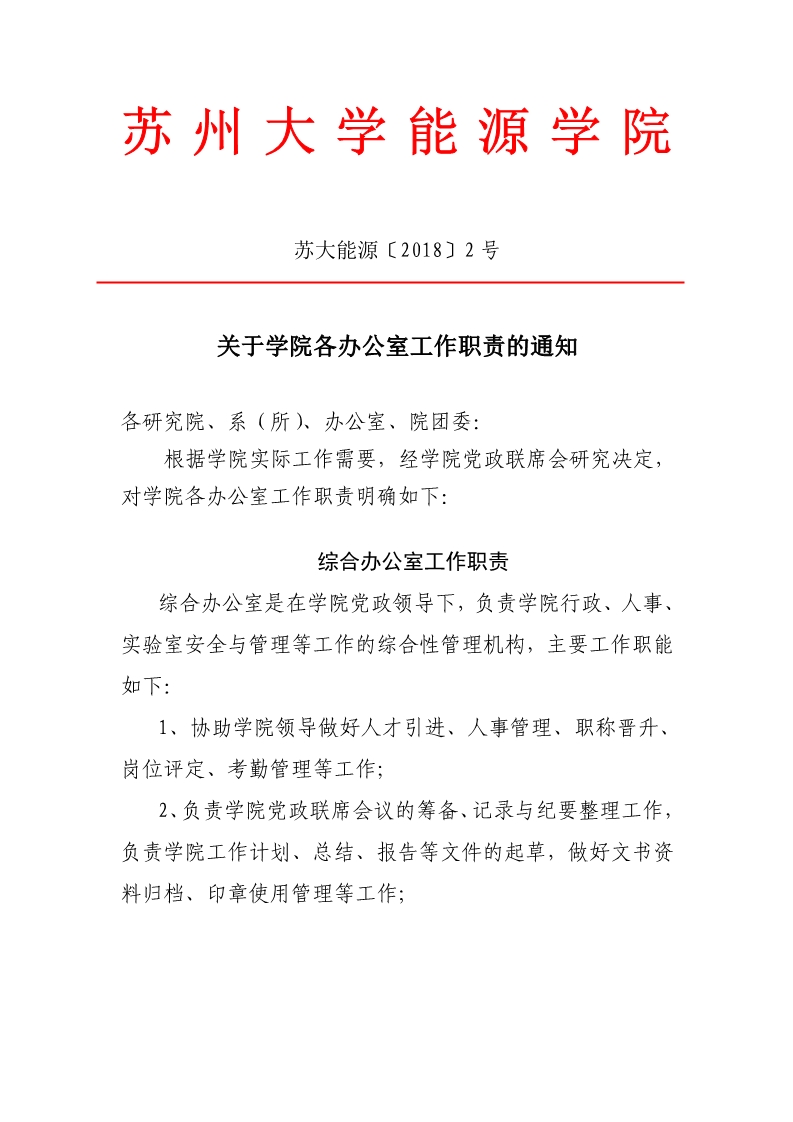 关于 财神捕鱼 各办公室工作职责的通知 苏大能源〔2018〕2号