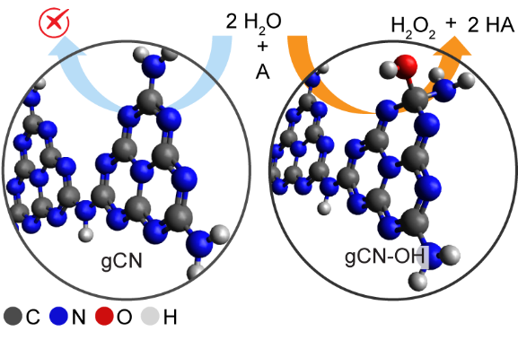 近日,作者构造了一种表面修饰羟基化的石墨相氮化碳的光催化剂,实现在可见光下驱动水的氢原子转移反应新方法。本工作通过研究gCN-OH解离水的过程,证实了石墨相氮化碳的表面羟基化是一种降低水活化能的有效途径。该方法用水替代了传统氢原子转移反应的供氢体,例如:氢气、醇类化合物、金属氢化物等等,克服了反应条件苛刻的局限性。gCN-OH在可见光照射下可高选择性地实现硝基苯的N-N偶联,苯甲醛的pinacol型C-C偶联以及溴苄的脱卤C-C偶联反应。并且gCN-OH具有持久的稳定性能、较高的量子效率,从而为染料、电子和制药行业提供了一种绿色、清洁、环境友好的合成策略。