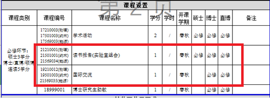 一、在2021级的培养方案中,有“读书报告”、“国际交流”、“论文写作指导”等必修环节,对应的培养方案学分和考核方式如下: