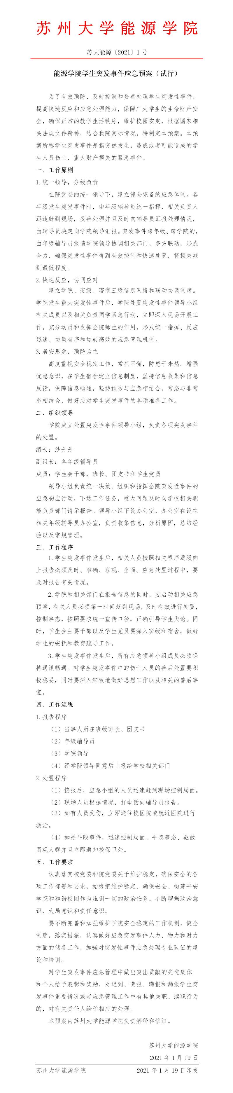 财神捕鱼 学生突发事件应急预案(试行) 苏大能源〔2021〕1号
