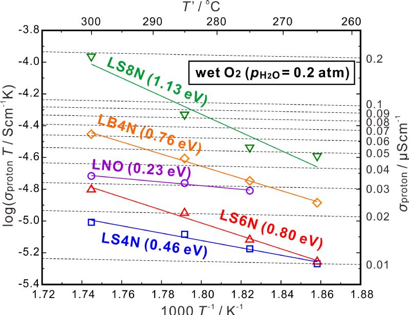 图1 加湿氧气(水蒸气分压:0.20 atm)下未掺杂的La2NiO4+δ(LNO)、