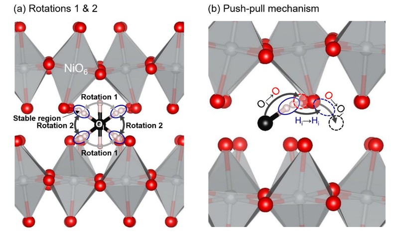近日, 财神捕鱼 韩东麟教授团队与京都大学Toyoura Kazuaki副教授、挪威奥斯陆大学Truls Norby教授合作,结合实验表征、理论计算、缺陷化学的理论分析,系统研究了Ruddlesden-Popper(RP)型阴极材料La2NiO4+δ和La2-xAxNiO4+δ(A = Ca, Sr, Ba)中的质子导电特性。结果表明,在250~300°C的温度区间内,质子电导率随着温度和Sr掺杂浓度增加而提高,相同掺杂浓度下,掺Ba样品的质子电导率显著高于Sr掺杂的样品(图1)。理论结算的结果揭示,上述材料中的质子以氢氧根离子形式通过push-pull机制进行迁移(图2)。因此,在RP型氧电极材料中,质子的实质载流子为氢氧根离子(OH-),表明La2NiO4+δ是空穴、氧离子和氢氧根离子的混合导体,将应用于PCFC的氧电极时,将呈现一种不同于已知模式的新型的阴极反应机制,这为进一步探索和优化RP型氧化物的混合导电机制,研发高性能的PCFC氧电极材料提供了全新的指导思路。