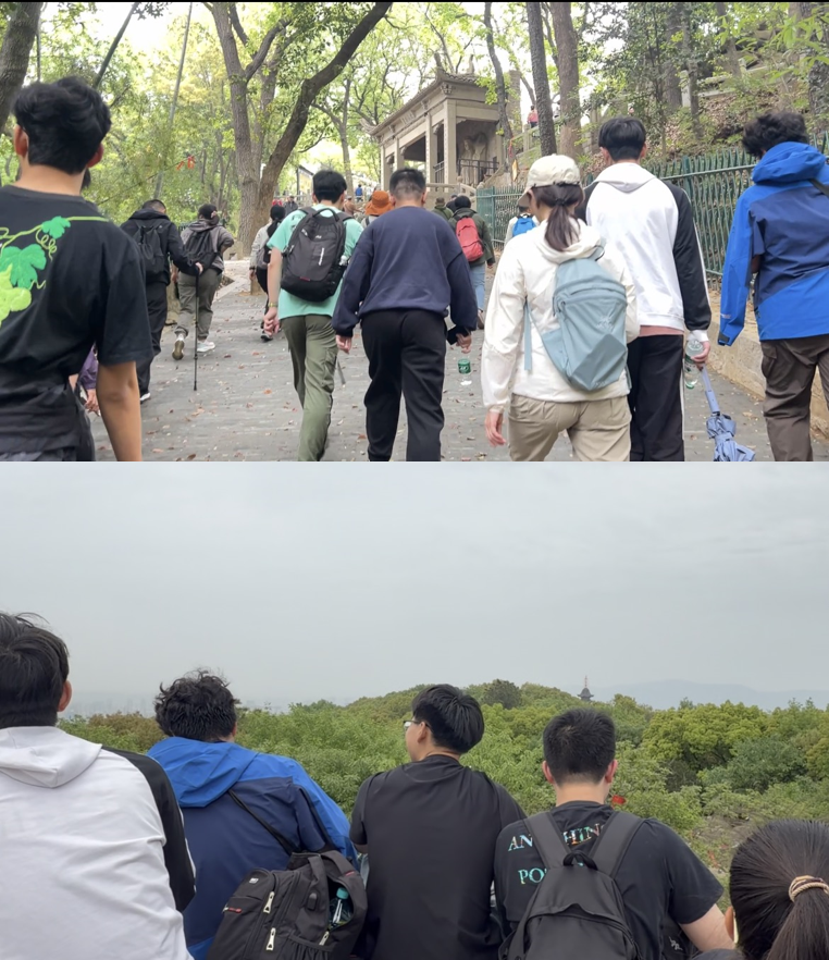 抵达灵岩山山麓后,全体成员迅速整队集合。随着登山指令的发出,同学们沿着蜿蜒山道拾级而上,结伴向峰顶进发。登山过程中,大家充分发扬互帮互助的团队精神,面对陡峭湿滑路段,体力较好的同学主动为同伴提供支撑与鼓励。尽管部分路程稍显崎岖、体力消耗较大,但没有一位同学掉队或放弃。一路欢声笑语相伴,最终全体成员顺利登顶。立于山巅,凭栏远眺,姑苏城景尽收眼底,同学们在感受“一览众山小”的豁达意境中,切身体会到了坚持运动带来的成就感与愉悦感。