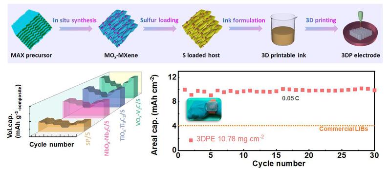 MXene材料自诞生以来因其优异的导电性、可调的结构、丰富的表面官能团等特质而倍受关注。需要注意的是,其剥离制备通常涉及HF的使用,往往阻碍了其大规模的应用。与此同时,在刻蚀的过程中伴随表面金属氧化物的产生。本文另辟蹊径,利用LiF-HCl为刻蚀剂,在水热的条件下,一步反应实现了MAX相的成功刻蚀并对其表面微氧化,获得了MOx-MXene的异质结,进而作为多功能、高振实密度的锂硫电池宿主材料。针对锂硫电池硫负载率低的问题,本工作使用3D打印技术实现梯度递增的硫负载量。3D打印助力获得多孔导电框架,相比于传统电极涂覆方法,可以实现反应过程中的电荷传输的加速、充放电过程中的体积膨胀的缓解、以及高硫负载下的电池性能的稳定提升。