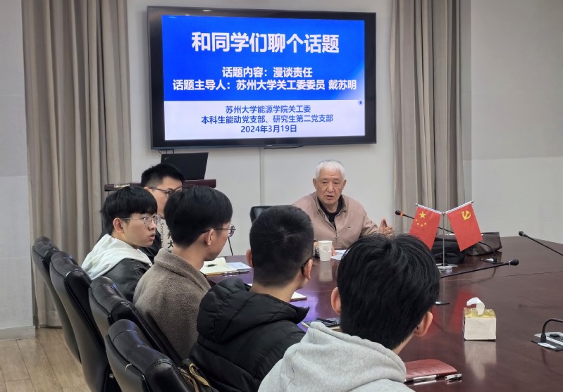 为持续深入学习贯彻习近平新时代中国特色社会主义思想和党的二十大精神,学习老一辈共产党员精神风范和坚守共产党人初心和使命,2024年3月19日下午,能源 财神捕鱼 关工委、本科生能动党支部、研究生第二党支部联合举办的“漫谈责任”主题座谈会在新能源大楼附楼102会议室举行,座谈会特邀 财神捕鱼 关工委委员戴苏明老师为话题引导人,会议由魏义凡老师主持。