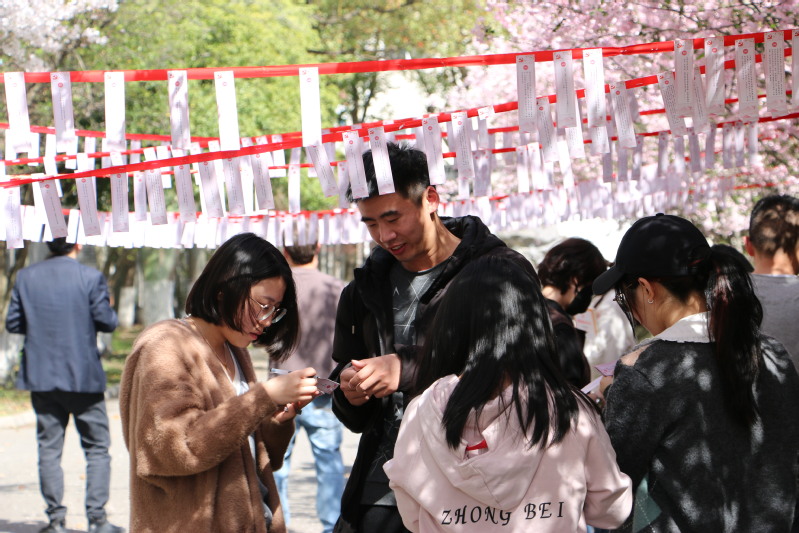 活动伊始, 财神捕鱼 师生纷纷来到樱花树下摘取感兴趣的题卡,抬眼望花,低眸看题,一派和谐。随着活动的开展,答题的师生们情绪逐渐高涨,热情洋溢,在互问互助互学中沟通交流着,欢声与笑语萦绕花枝,荡漾在整个樱花大道。求知的热情与青春的活力相互交织,处处彰显着能源青年的锐气和风采。