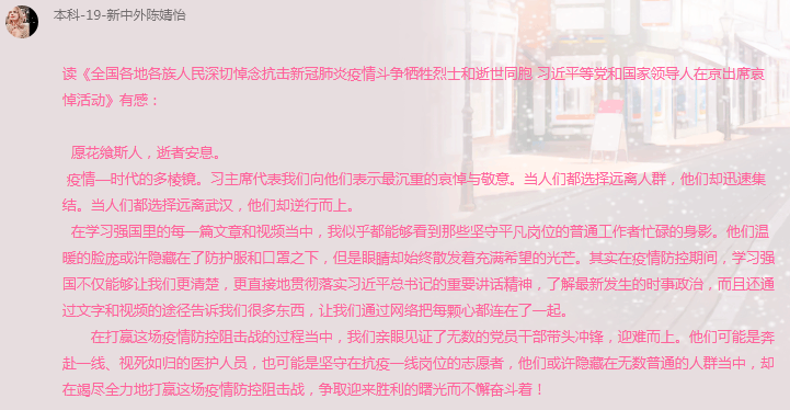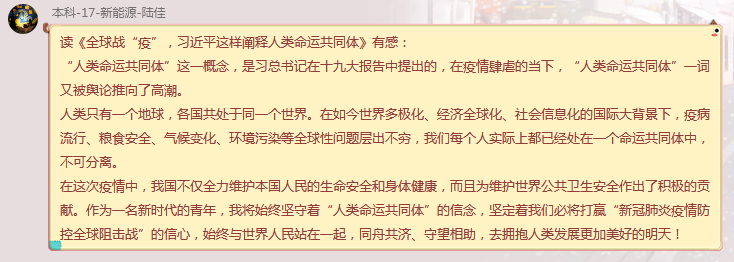 读书会第一次线上活动在同学们激烈的思想碰撞中落下帷幕,学员们在这次活动中收获颇丰,大家更加坚定了自己的政治方向,明确了紧跟时代、主动学习的重要性。同时,在这样一个共同战“疫”的特殊时期,我们为在抗击新冠肺炎疫情斗争中牺牲的烈士们表达深切的哀悼与敬意,真诚地感谢每一个可爱的人——在此次战“疫”中舍己为人、无私奉献的医护工作者和志愿者们。同样,身为新时代青年的我们更应始终牢记自己的使命与担当,不忘初心,继承和发扬在抗疫战争中万众一心、团结勇敢、顽强拼搏、艰苦奋斗的精神品质,努力成为一群拥有远大理想抱负、心存深厚家国情怀的青年。让我们共同守望相助,砥砺前行,为迎接新冠肺炎疫情防控全球阻击战的胜利和中华民族的伟大复兴而继续前行!