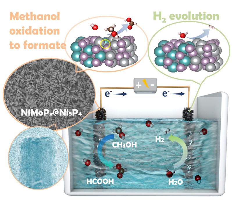 目前,电解水产氢技术(OWS)的主要瓶颈在于高能耗和动力学缓慢的阳极析氧反应(OER)。另外,由于阳极产物(O2)的价值低、与氢气混合易爆燃,使得制氢的整体效益更低。为进一步提高成本效益,用其他低能耗且增值的阳极反应替代高耗能且低值的OER反应具有很好的应用前景。甲酸作为一种重要的工业原料,通常需要在高温高压的苛刻条件下进行合成,因此电化学氧化甲醇制备甲酸是一种增值且绿色环保的方案。镍基催化剂已广泛用于OER和MOR等反应中,一般认为镍基MOR催化剂遵循间接氧化路径,其动力学过程高度受限于Ni(OH)2/NiOOH转换速率;如何实现不依赖于Ni(OH)2/NiOOH过程的直接甲醇氧化路径从而改善MOR的动力学过程仍面临挑战。