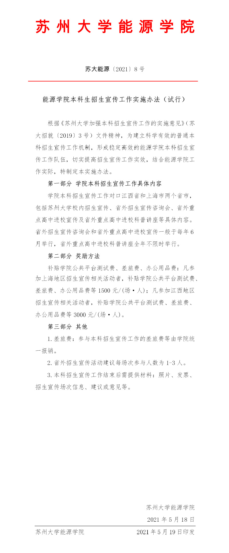 财神捕鱼 本科生招生宣传工作实施办法(试行) 苏大能源〔2021〕8号