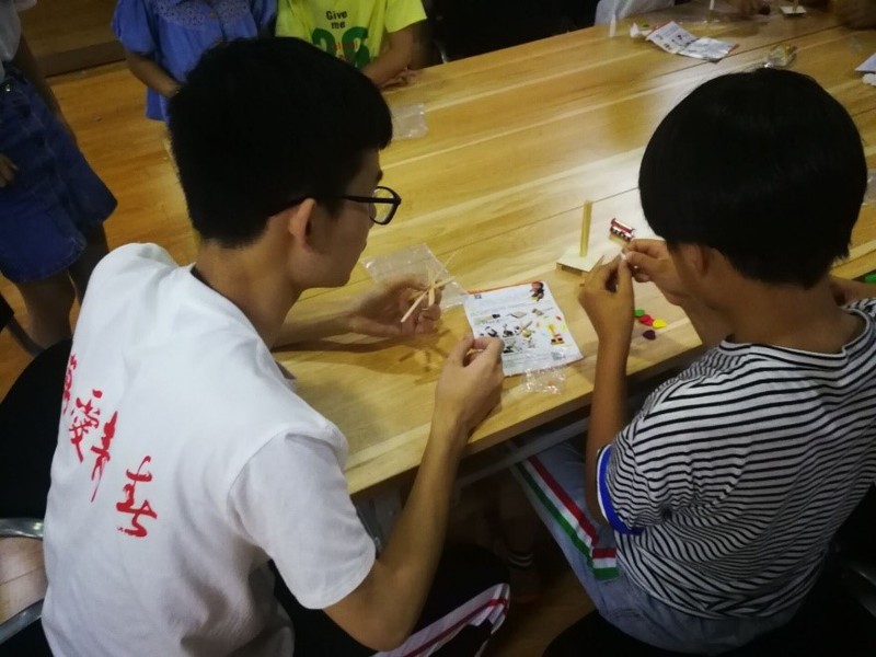 休息了一会之后,小朋友们听说还要组装空气动力车,开心地又蹦又跳。虽然小车的组装并没有太大的难度,但却需要细心认真才能完成,接连有几个小组装反了小车的轮子。装好了之后,仍有几个小组的小车跑不动,小朋友们并没有气馁,积极地寻找问题。最后,在志愿者的帮助下,所有的小车都成功地跑了起来。小朋友们在空地上比起了谁的小车更快,玩得不亦乐乎。