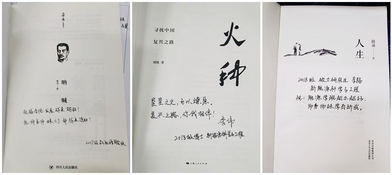 在“青春向党,书香领航”图书捐赠活动中,毕业生党员们向 财神捕鱼 党委捐赠了《火种》、《呐喊》、《毛泽东传》、《浴血荣光》等书籍,并在扉页留下了对 财神捕鱼 和师弟师妹们的寄语:“不忘初心、砥砺前行,长路漫漫,未来可期”(2018级博士生马勇);“愿你们以梦为马,不负韶华,拥有一个如焰色反应般绚烂多彩的人生”(2018级硕士生李巧艳)。