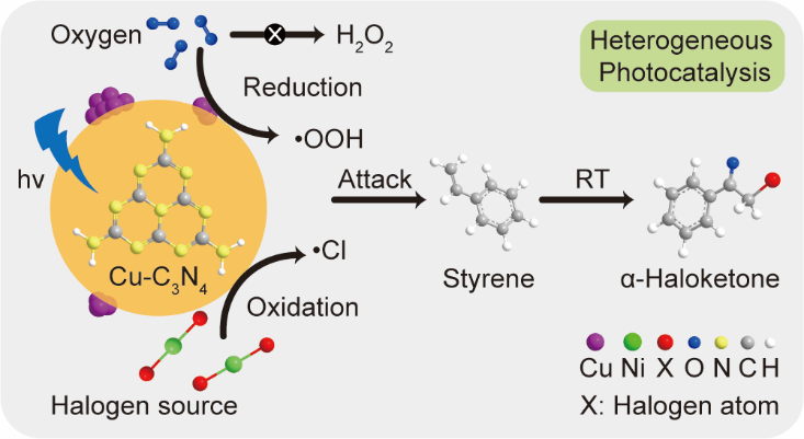 在本论文中,作者提出了一种金属助催化剂的策略,在可见光、室温和空气条件下,实现了从苯乙烯基化合物到α-卤代酮类化合物的选择性合成。研究表明,作为最佳助催化剂的金属铜负载在g-C3N4表面之后,能够调控生成的氧自由基的种类、生成氯自由基的数量、抑制过氧化氢的产生、促进反应中生成水分子的脱附,从而提高α-卤代酮类化合物的选择性。同时Cu-C3N4催化剂还具有较好的稳定性,能够在太阳光辐照下完成底物的转化,也有希望应用于流动相光反应器,展现出很好的应用前景。