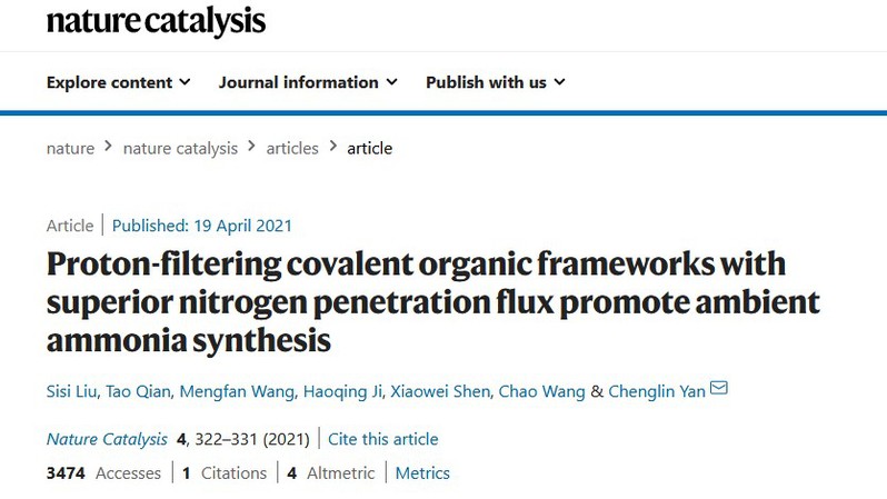 近日, 财神捕鱼 晏成林团队在绿色低碳合成氨领域取得新进展,实现在常温常压条件下合成氨的产率和法拉第效率的大幅度提升,研究成果以“Proton-filtering covalent organic frameworks with superior nitrogen penetration flux promote ambient ammonia synthesis”为题发表于《自然催化》(Nature Catalysis)期刊上。